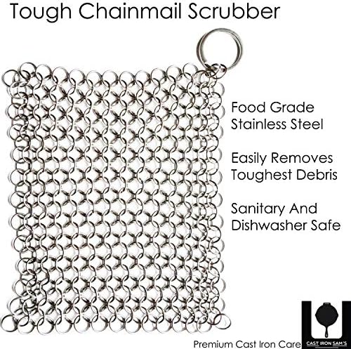 EFFORTLESSLY CLEANUP AFTER COOKING: Cast Iron Sam’s chain mail scrubber lets you effortlessly clean all your cast iron cookware – without damaging the seasoning. It’s so easy it makes you want to you use you cast iron every day! Compatible with all brands of cast iron: Lodge, Camp Chef, LeCreuset, Finex, Stargazer, Wagner, Utopia Kitchen and all others. Make your cast iron cleaner with less effort.