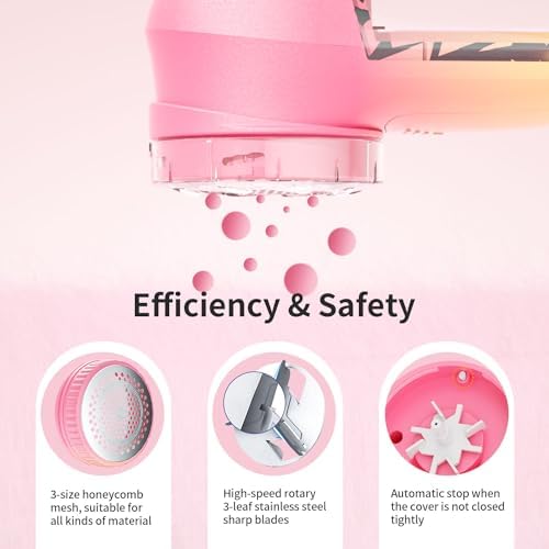 [Efficient & Safe] The Upgraded Large Shaving Surface and High-speed rotary 3-leaf stainless steel sharp blades help to finish the job quickly with less effort. The honeycomb shaver foil ensures your fabrics aren’t cut or snagged, the Blades SAFETY LOCK mechanism ensures it’s Safe for cleaning or touched by your children accidentally.