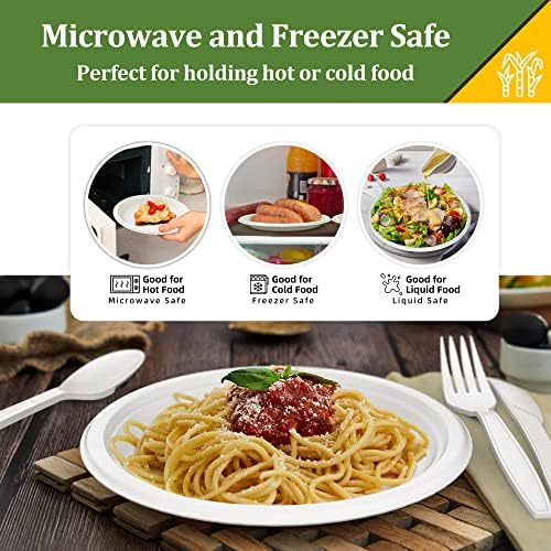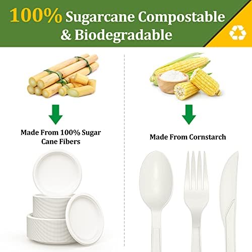 🌳【Natural Material & Eco Product 】Our biodegradable plates are made from 100% sugar cane fibers and the cutlery is made from cornstarch, which is plant-based and eco-friendly, can be dissolved by the environment.