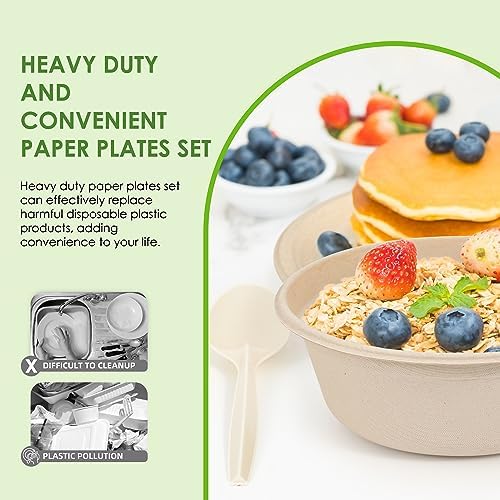 🌳【Microwave and Refrigerator Safe】Durable compostable paper plates for party are safe to use, with food surface contact safe standards. Microwave safe up to 248°F. Oil and leak resistant, it can hold a generous amount of food without breaking or soap through.
