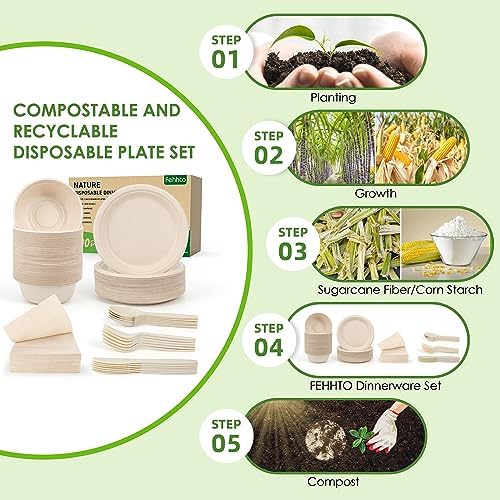 🌳【Natural Material & Eco Product 】Our biodegradable plates are made from 100% sugar cane fibers and the cutlery is made from cornstarch, which is plant-based and eco-friendly, can be dissolved by the environment.