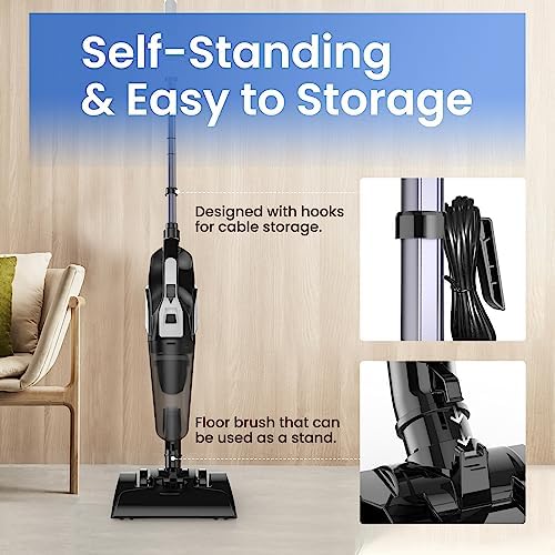 【Lightweight & Easy to Use】This corded vacuum cleaner only 2.2 lb. as handheld vacuum and 3.6 lb. as stick vacuum. Easy to push with one hand and effortless to use. Small vacuum cleaner with its 20 Ft cable you can take it with you wherever you want to clean. Just plug it in and it works, so you don’t have to worry about running out of power, needing to charge it, or other battery issues.