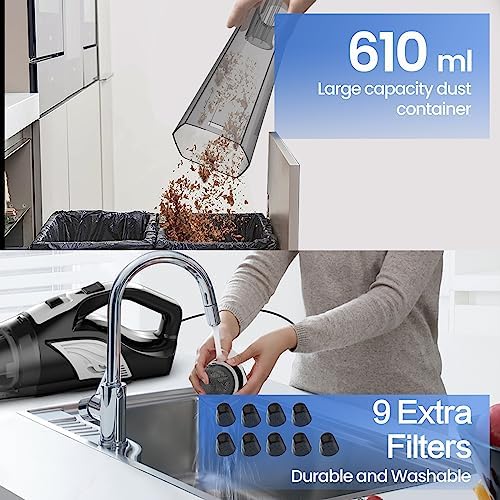 【Upgrade Non-woven Filter】This bagless vacuum cleaner comes with 9 replaceable non-woven filters, high-density filtration system that is durable and easy to clean. If you notice that the suction power is decreasing, you can replace the filters in time to get powerful suction again.