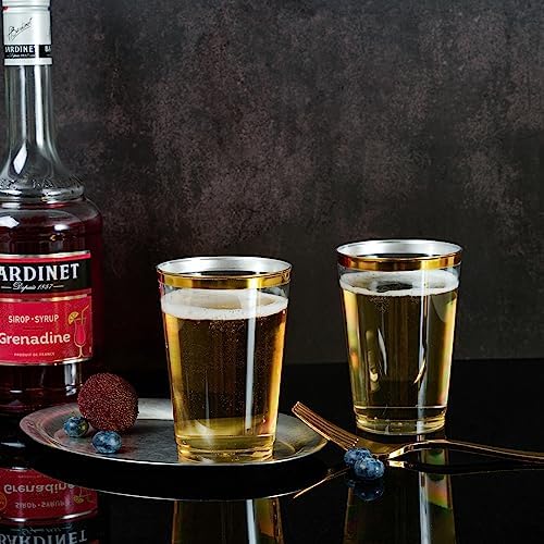 These 12 ounce plastic cups with gold rim are not only sturdy and practical but also add elegance to your party. The 12 ounce gold rimmed plastic cup can match any color beverage, perfect for wine, champagne, juice, beer, liquor and various mixed drinks