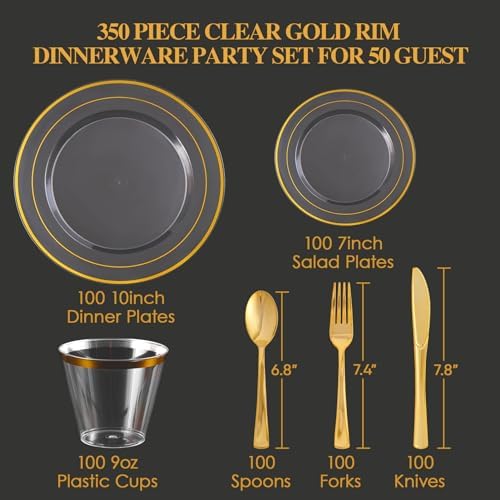 50 Premium Heavy Duty Clear Gold Rim Design Disposable 10″ Dinner Plates and 50 7″ Salad Dessert Appetizer Plates – Disposable Plastic Gold Silverware Set 50 Plastic Forks, 50 Plastic Spoons, 50 Plastic Knives.