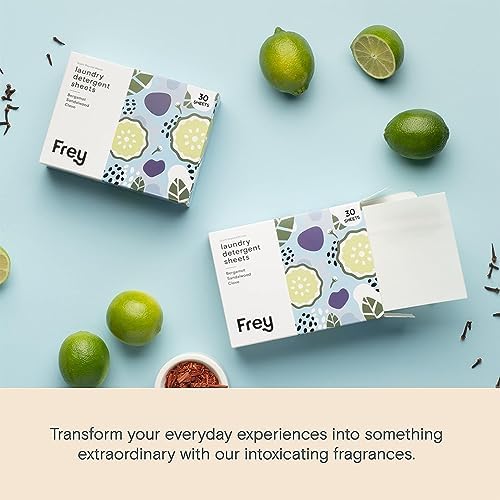 Transform your laundry routine with FREY’s revolutionary Laundry Detergent Sheets. These sheets effortlessly combine effective cleaning with captivating fragrance, turning every load into a refreshing experience. Embrace sustainability with our plant-derived solution, reducing Carbon Emissions by over 90%. Dispose of the sheets and cardboard thoughtfully, as they are easily recyclable and biodegradable.Experience the ultimate convenience by simply adding a sheet to your washing machine along with your clothes. For medium loads, each box contains 30 sheets, ensuring efficient and thorough cleaning. Enhance your laundry further by pairing our Detergent Sheets with our dryer sheets, adding a touch of luxury and long-lasting freshness to your garments.Discover a new approach to laundry with FREY’s Laundry Detergent Sheets. Rest assured, even stubborn stains like oil, red wine, blood, and coffee are no match for the power of advanced surfactants and enzymes. Your clothes will emerge cleaner and fresher with each wash.These lightweight, compact sheets are perfect for travel. Whether you’re on the go or at home, you can enjoy the convenience of mess-free laundry. Take them along on your adventures without any concerns about leaks, allowing you to create cherished memories worry-free.Reimagine your laundry routine with FREY’s innovative sheets, delivering both effectiveness and fragrance to your everyday life. Embrace sustainability and redefine cleanliness with FREY’s Laundry Detergent Sheets. Experience a new standard of convenience and long-lasting freshness with every wash.