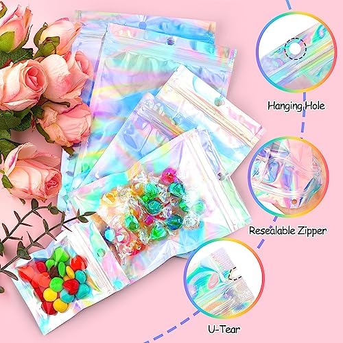 Funfery 100 pcs Mylar Holographic Bags Clear Window Resealable Bags,Foil Bag with Zipper,Sealing Pouch Smell Proof Packaging Bags for Food Storage,Candy,Party Favor Sample Business Supplies(5.5×7.9in)