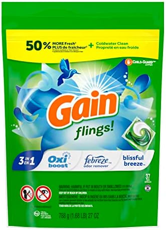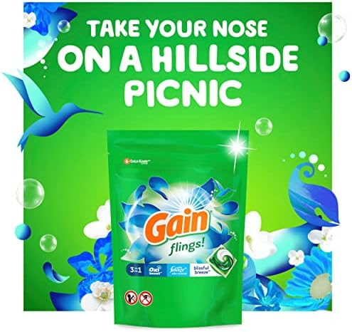 Gain flings! laundry detergent pacs are packed with 50% more scent than Gain liquid laundry detergent. Armed with the stain-fighting power of Oxi and Febreze, they give you nothing but great, clean, amazing-smelling laundry. Use with any laundry set-up, because Gain flings! Pacs dissolve in both hot and cold water and are HE compatible. The light, delightful scent of new Blissful Breeze flings will make your nose feel fresh like you’ve never felt before. A sniff of Gain Blissful Breeze gives you the great feeling of dancing on a breeze-kissed hillside – while dandelions tickle your face under bright Summer sunshine.