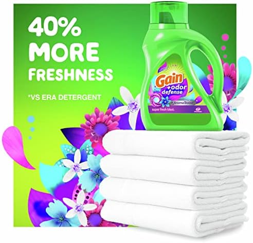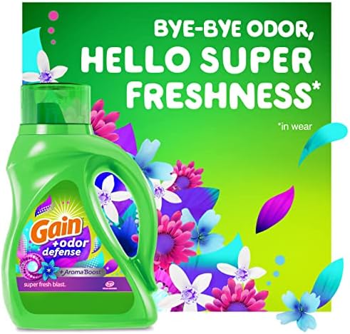 Pssst! Want to smell as fresh as you look? Containing 40% more freshness ingredients*, Gain with Odor Defense Liquid Laundry Detergent Super Fresh Blast Scent lifts away tough odors at the source, instead of masking them. So you get the funk out of your clothes and only smell the delightful scent of nature, for a long-lasting nostril-licious scent experience. Pair it with other Gain + Odor Defense Super Fresh Blast products for a truly irresistible experience. For medium loads, fill to bar 1, for large loads, fill to fill to bar 3, and for high efficiency full loads fill to bar 5. *vs Era detergent