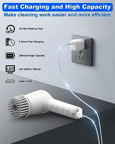 【USB-C Fast Charging and Power Display】 Electric Spin Cleaner features the latest USB-C charging port design with a built-in 2,500mah rechargeable battery that can last 120 minutes after only 2 hours of charging. The electric shower scrubber can clearly know the remaining power through the LED display, which is very convenient to use.