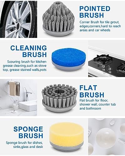 【Multi-Function Brush Head】Electric bathroom scrubber comes with 4 brush heads to meet your different cleaning needs. Corner brush is suitable for cleaning edges and corners, flat brush is suitable for cleaning floors, shower walls and bathtubs, scouring brush is suitable for cleaning cooktops, greasy walls and POTS, sponge brush is suitable for cleaning dishes, sinks, glass and desks.