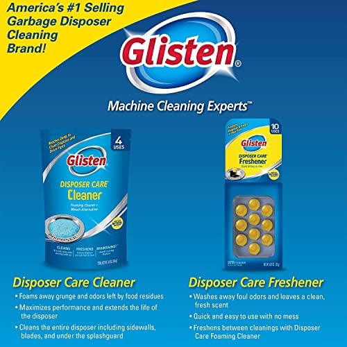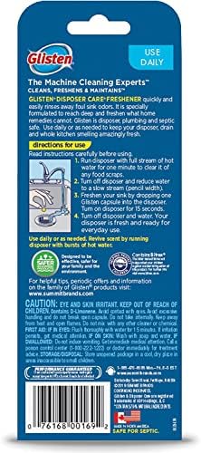 Lightly trapped food down in the kitchen sink can wreak havoc on your home sweet home. Fight back against deep sink odors with Glisten Garbage Disposer Freshener, a bleach alternative with freshening power. The disposer deodorizer is a convenient and easy way to freshen the disposal between thorough cleanings. With no harsh chemicals, the capsules rinse away tough grunge and garbage disposal smells, leaving the sink and the whole kitchen smelling fresh. The freshener works in all disposals and is plumbing, pipe, sink, drain, and septic-friendly. Mess-free and fast-working, the convenient capsules pack a powerful punch. The disposer and drain deodorizer helps clean, freshen, and maintain disposal systems. While home remedies, air fresheners, and regular cleaning sprays or gels cover the surface, the drain disposal cleaner gets down deep to deliver superior freshening performance. The capsule quickly breaks down stubborn food particles, grease, and oil lurking in the disposer for a fresh smell in your kitchen. Use the odor remover daily or as needed to keep your disposal and drains odor-free. Eliminate foul garbage disposal smells with the drop of one capsule. How to use: run the disposer with a full stream of hot water to clear any food scraps; turn off the disposer and reduce water to a slow stream (pencil width); drop in one capsule and turn on the disposal for 15 seconds; turn off the disposal and water and enjoy a fresher sink. The combination of hot water and powerful disposal action releases the encapsulated fresh scent to quickly and easily rinse away foul sink drain odors. Revive the pleasant lemon scent by running your disposal with bursts of hot water. Please read package instructions before use. Glisten, the machine cleaning experts, offer a full line of household products designed to powerfully clean and freshen appliances and help keep them performing optimally and lasting longer. Create a deeper, more enduring clean in your kitchen and laundry appliances with Glisten.