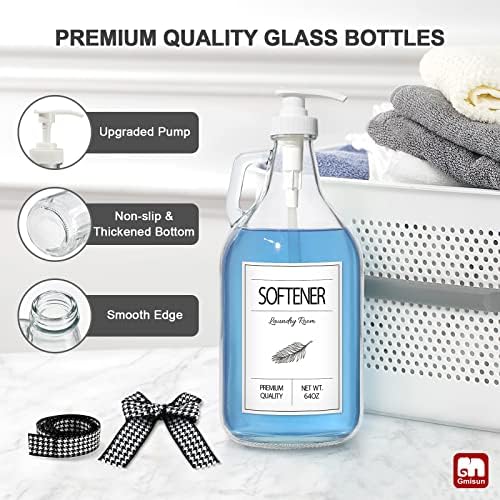 【Complete Accessories for Laundry Room Organization】GMISUN detergent dispenser set is more complete. Comes with glass pump dispenser × 2, waterproof labels × 4 (Detergent, Softener, Bleach, Blank labels), ribbon x3, measuring cup x1.You can choose the decorative Set by yourself, we match 2 kinds of black and white tops in total 6 pieces (pump and screw cap), screw cap or pump head. If you need to dispense other liquids, we provide 1 extra blank label so you can repurpose the bottle.