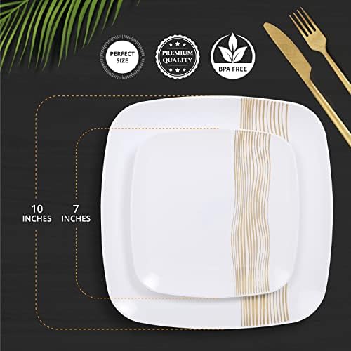 Gold Plastic Plates For Party – 40 Pack – 20 Square Plastic Plates 10.25 Inch And 20 Small Gold Plates 7.5 Inch – Heavy Duty Fancy Plastic Plates – Premium Disposable Plates For Party And Wedding