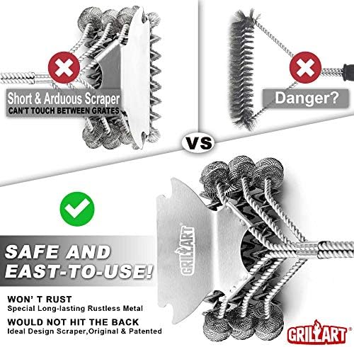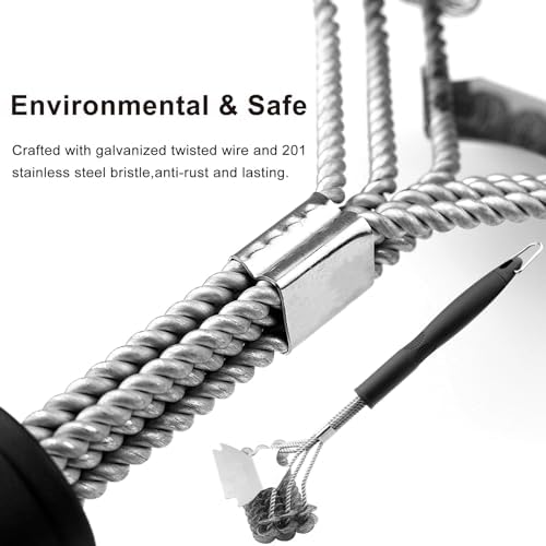 【Built to Last】: 120% more rigid triple helix than other safe grill brush bristle free, ensuring its feature of Long Lasting. 18inch tough plastic handle with a better grip, protects your hands from burning and ensures it will not bend or snap