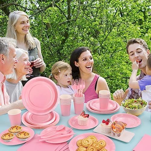 Gudvilla 168PCS Light Pink Paper Plates and Napkins,Pink Disposable Plates Set with Pink Utensils Serve 24 Guests,Pink Birthday Decorations for Women Wedding Baby Shower Gender Reveal Party Supplies