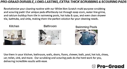The Pro-Graad 6 piece kit includes 5x White Non-Scratch Cleaning Scrubber Pads and 1x Interchangeable Handle. This cleaning solution is perfect for a variety of surfaces and cleaning occasions. It is especially suitable for cleaning boats, pools & hot tubs, fiberglass tubs, showers, shower doors, ceramic tiles, and even wooden floors. The fine non-scratch WHITE pad is ideal for both hard and soft materials, and ideal for removing soap scum, waterlines and calcium buildup from tile in swimming pools, hot tubs & spas, cleaning shower tile bathtub and sinks. It is also great on vinyl, plastic, glass, and upholstery. The interchangeable handle grips onto each individual pad with small hooks, and can also be used and re-used with other scouring pads. The handle of our product is designed with your comfort in mind. It offers a secure grip, which ensures that you won’t lose your hold, even when your hands are wet. Additionally, it provides excellent leverage for efficient cleaning and protects your hands from any potential harm.