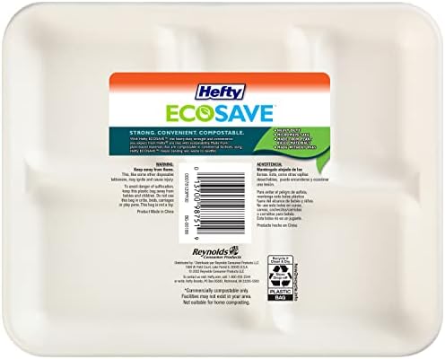 Hefty ECOSAVE Compostable 5-Compartment Paper Trays make cleanup easy. Made without PFAS and with durable and microwave-safe plant-based material, these disposable paper trays are compostable in commercial facilities. These five-compartment trays make it easy to keep food separate for little ones or to sample a little of everything at a potluck or family gathering — plus it makes cleanup easy when you’re all done. Signature strength delivers the heavy duty quality you’ve come to expect from a Hefty plate. Don’t forget: all Hefty products are backed by a 100% satisfaction guarantee. Hefty ECOSAVE Compostable Trays make clean-up easy.