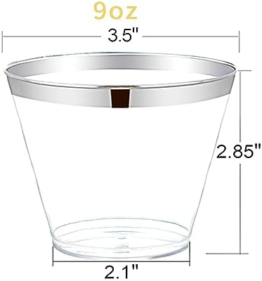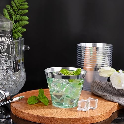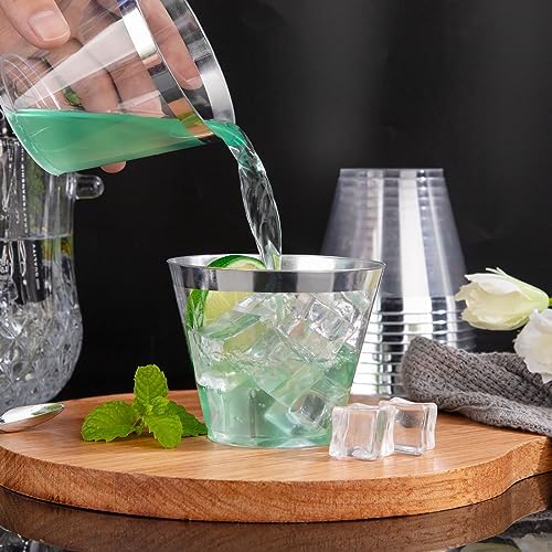 Hioasis 200pcs Silver Plastic Cups Disposable, 9oz Clear Plastic Tumblers Cups with Silver Trim, Clear and Silver Party Cups Pefect for Wedding & Party