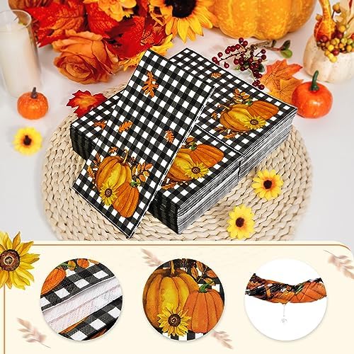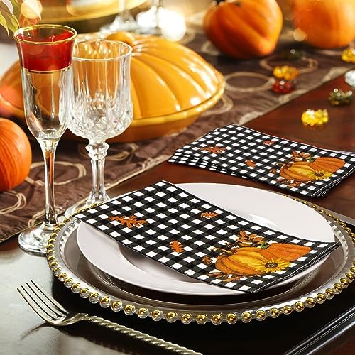 Homlouue 100 PCS Thanksgiving Napkins 3-Ply Disposable Pumpkin Napkins for Thanksgiving Harvest Fall Party Holiday Autumn Black White Plaid Paper Guest Towels For Bathroom Kitchen Home Decoration
