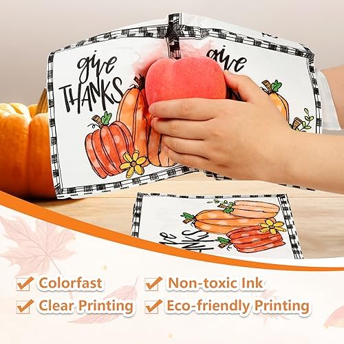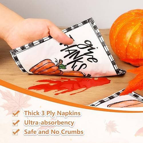 HIGH QUALITY: Our 3-ply watercolor napkins are printed with non-toxic inks and can be used directly to contact food. In addition, our Thanksgiving napkins are soft and absorbent. They do not fade and are not easily damaged after absorbing water.