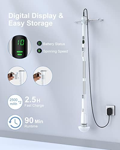 [𝟐-𝐢𝐧-𝟏 𝐋𝐄𝐃 𝐃𝐢𝐬𝐩𝐥𝐚𝐲 & 𝐅𝐚𝐬𝐭 𝐂𝐡𝐚𝐫𝐠𝐢𝐧𝐠] The cordless cleaning brush has a LED display that shows the remaining battery and the selected spin speed, easily to know when the charging is needed. Also, our electric bathroom scrubber adopts fast-charge tech that can be fully charged in 2.5 to 3 hours. With the 2*2500mAh high-capacity battery, the scrubber can work last up to 90min, totally enough to clean the whole house. The equipped adapter, 5.9ft long cable and hook make it easy to store and charge.