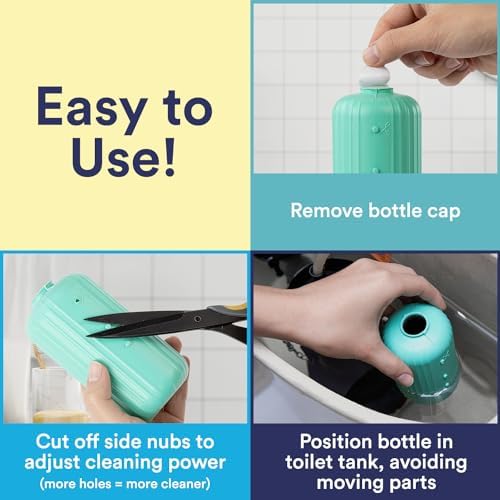 Easy, Consistent Cleanliness — Take out the top cap from the toilet tank cleaner bottle. Cut off the nubs on the side. The more holes you make, the more toilet water cleaner is used per flush. Place the toilet automatic cleaner into the tank. Each bottle will last 1-2 months depending on use