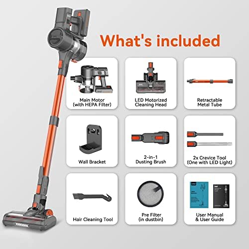 【Multifunctional & Lightweight Vacuum】It’s lightweight and portable the main motor is only 3 pounds about 1 bottle of 1000ml water so you can take it anywhere or go & down stairs. With versatile attachments(Freebie LED long crevice), the household vacuum cleaners can easily detach from a handheld vacuum. It can be applied to different scenarios such as furniture, ceiling, stair, or car, which solves the troubles of traditional vacuum cleaners that are inconvenient to clean hard-to-reach corners