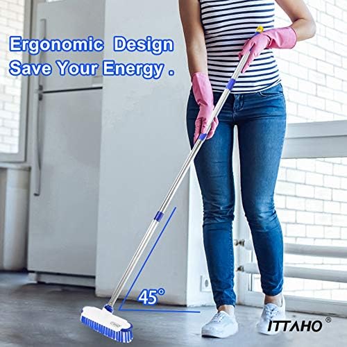 ERGONOMIC DESIGN: 45° angle cleaning scrubber, save your energy and protect your back and knees from pain on housework. The brush head and the handle are easily connected by threaded tip.The deck brush(push broom) comes with a wide scraper,which is easily scrape off sewage and obstinate dirt after washing the patio, deck and floor.