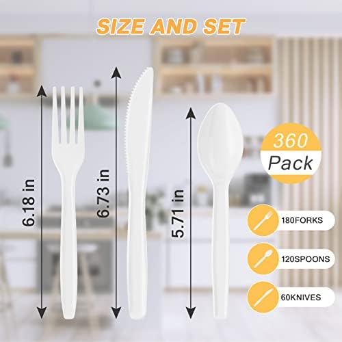 Size:Fork: 6.69″L, Knife: 7.09″L, Spoon: 6.53″L. Color: Whte Packing Include:360 PACK Packing Size: 11″*6.9″*13.15″ Package Weight: 3.21 lb