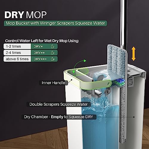 [HANDS-FREE WASH&DRY] Flat Squeeze Mop Bucket Set. Self cleaning mop, SAVE your time and labor, let the bucket do more than by yourself, mopping is just between mop and bucket, be free from dirty water, All you need to do is inserting and pulling the mop.