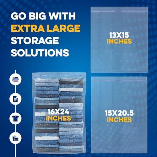 Experience the joy of a perfectly organized home with our versatile clear plastic bags. These jumbo-sized zipper-top bags are your ultimate solution for clutter-free living and freezer-safe food storage. Bring order and efficiency to your space with transparent bags that are easy to see inside closets, garages, RVs, luggage, and wherever you need them.