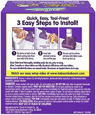 Kaboom Scrub Free! Continuous Clean Toilet Cleaning System with OxiClean is the easiest way to keep your toilet sparkling – just attach the device and start flushing! Our powerful bleach-based formula takes over the job of scrubbing the toilet bowl. It does the hard work and you get to ditch the dirty brush, plus, it’s safe on septic systems and won’t harm toilet parts. All that’s left to do is step back and enjoy the satisfaction of knowing your toilet is clean and keeps being cleaned every time you flush – even under the rim! The Kaboom Scrub Free! Continuous Clean Toilet Cleaning System with OxiClean includes one device and two refill pouches, each lasting up to three months for up to six months of continuous cleaning. At Kaboom, we’ve always been passionate about providing the best possible bathroom cleaning experience, our products are specially formulated to provide a clean you can see!