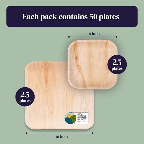 Kijani Palm Leaf Plates | Like Disposable Bamboo Plates | 10 & 6 Inch Square Party 50 Pack | Biodegradable, Compostable & Eco-friendly | Sturdy & Durable Wood Style Plates