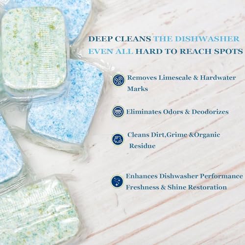 HEAVY DUTY: Time release effervescent dish tabs for dishwasher dissolve slowly for maximum efficiency removing grimy mineral and hard water build up and odor causing residue which helps enhance your dishwasher machine cleaner lifespan