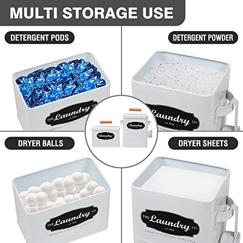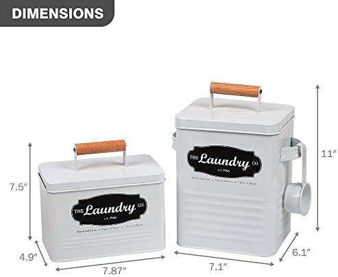 Environmentally Friendly: Our metal laundry container provides environmentally friendly storage for your laundry powder and dryer sheets, in place of cardboard or plastic containers. This set also includes a reusable scoop to reduce waste. User Friendly Design: This all metal laundry powder container design creates easy to scoop powder, and features a secured wooden-handle lid for easy removal of lid. The lid on our farmhouse storage bins keeps your laundry essentials hidden while stored. The powder soap dispenser also has two side handles to easily move the canister to other areas. Two Containers in Each Set: Our large size detergent container for laundry room (11′ x 7.1″ x 6.1″) can hold a large quantity of laundry powder, pod detergent, dryer balls, “lost socks,” and more while the small size dryer sheet container (7.87″ x 7.5″ x 4.9″) holds a large quantity of dryer sheets, clothespins, and more. Our canisters are great as laundry room decor and organization for your laundry accessories. Note- pods, clothespins, dryer balls, dryer sheets, detergents, etc as shown in display pictures are not included.