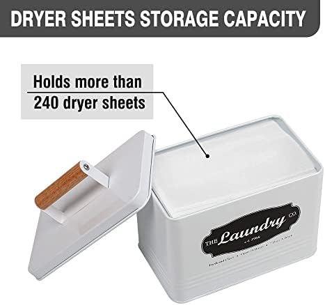 Durable- Our laundry detergent storage container and dryer sheets container includes metal and wood materials for a durable storage option, and a modern design printed directly onto the tin.