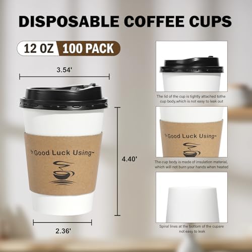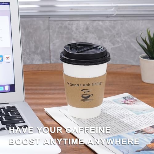 【Great Value Pack】The package includes 100 packs 12 oz white coffee cups with black lids and kraft sleeves, can cater to your parties and special events.