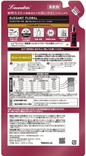 LAUNDRIN Laundry Fabric Softener with Organic Extract – Elegant Floral – Refill Pack – Made in Japan – Essential Hub – Set of 2 Pieces – 2 x 480 ML. – Return Policy: These products are NON-returnable, and NON-refundable as they are overseas shipment unless products are not correct as shown on Amazon’s page, defective, or damaged. – Made in Japan – Contain organic extract – Suppresses unpleasant odor due to bacterial growth – Suppresses static electricity, and adsorption of dust, and pollen – Can be used with baby clothes – Softens, and smoothens clothing – Reduces friction between skin, and clothing – Top: Rose, muguet, and jasmine – Middle: Patchouli, and iris – Last: Musk, amber, sandalwood Ingredient Surfactant (di alkyl ester ammonium salt)