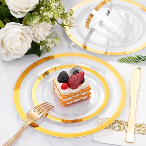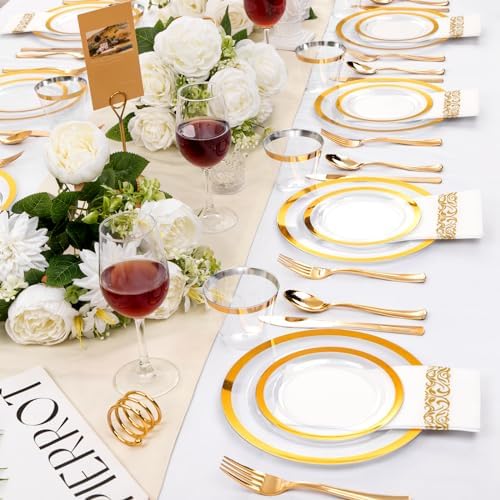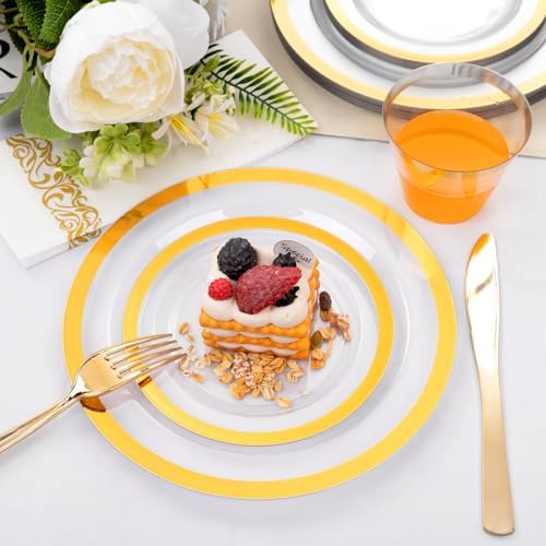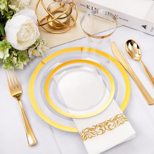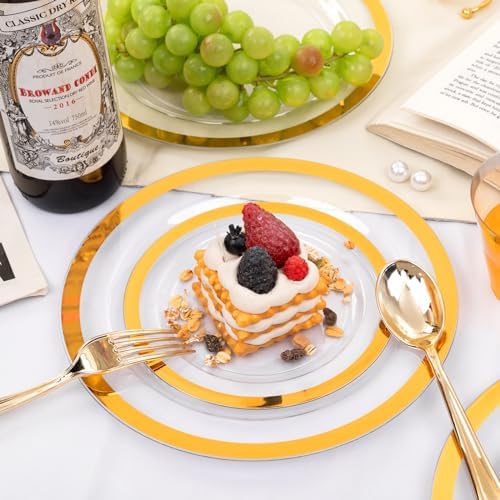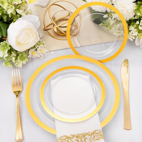 BEAUTIFUL DESIGN: Clear plastic plates with gold trim and an ornate golden silverware set complement each other in a luxurious gold serving party color ensemble bursting with style. Add a touch of elegance and refinement to your next party or dinner function.