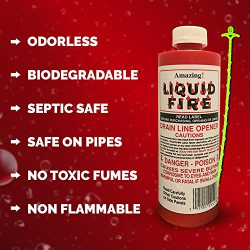 Liquid Fire provides a powerful, fast-acting solution for both slow-running and fully clogged drains. It works great for drain pipes in sinks, tubs, shower stalls, plus septic tanks and laterals. It is destined to make things flow right down the drain. As you pour Liquid Fire into a clogged or slow running drain, it reacts instantly creating heat. It provides heat to free frozen drains. It works faster and more effectively than most other popular cleaners and is more economical. It is very effective on grease, hair, toilet paper, soap scum, organic materials, body oils, calcium and lime buildup, rust, flush-able baby wipes, toothpaste, etc. Liquid Fire drain line opener may get the job done when your drain is slow. Please read the directions carefully and heed all the warnings. Use the product in a well-ventilated area, wear rubber gloves, and keep children and pets away from the drain.