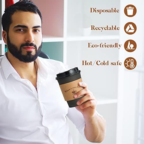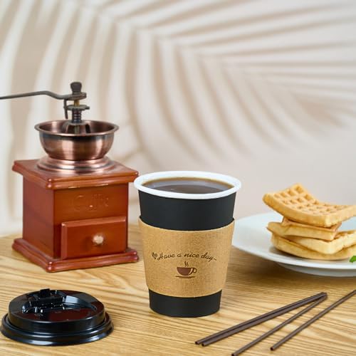 LITOPAK 100 Pack 12 oz Paper Coffee Cups, Drinking Cups for Hot Coffee Chocolate Drinks, Disposable Coffee Cups with Lids, Sleeves and Stirring Sticks, Black Hot Coffee Cups for Home and Cafes.