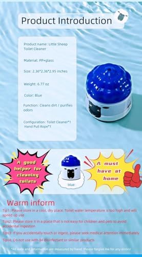 Name Little Sheep Toilet Cleaner Material PP+ glass Dimensions 6*6*7.5cm weight 200g color blue function Clean stains/purify the air Configure Detergent*1 Hand drawstring*1
