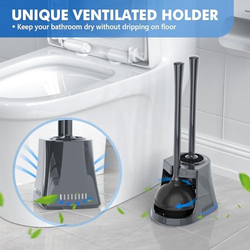 LOVLOY Toilet Plunger and Brush, Silicone Bowl Brush and Heavy Duty Toilet Plunger Set with Ventilated Holder, 2-in-1 Toilet Brush and Plunger Combo for Bathroom Cleaning (Grey, 1)
