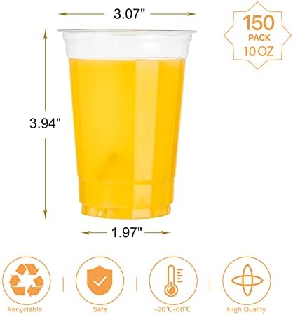 RECYCLABLE & COST-EFFECTIVE: Our clear party cups are recyclable (recyclable number one). You can simply throw them away after use, saving you the hassle of cleaning. This set includes 150 pieces of 10 ounce plastic cups, offering great value and time-saving convenience.