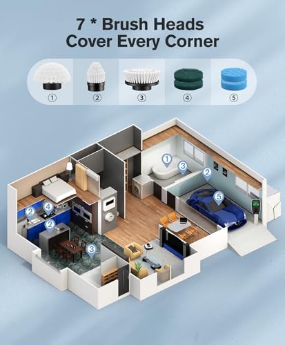 7 Interchangeable Brush Heads Suitable for Different Scenarios. Such as tubs, sinks, and other recessed areas, corners, crevices, and other narrow or hard-to-reach areas, floors, stone tiles, glass, car surfaces, and stoves.