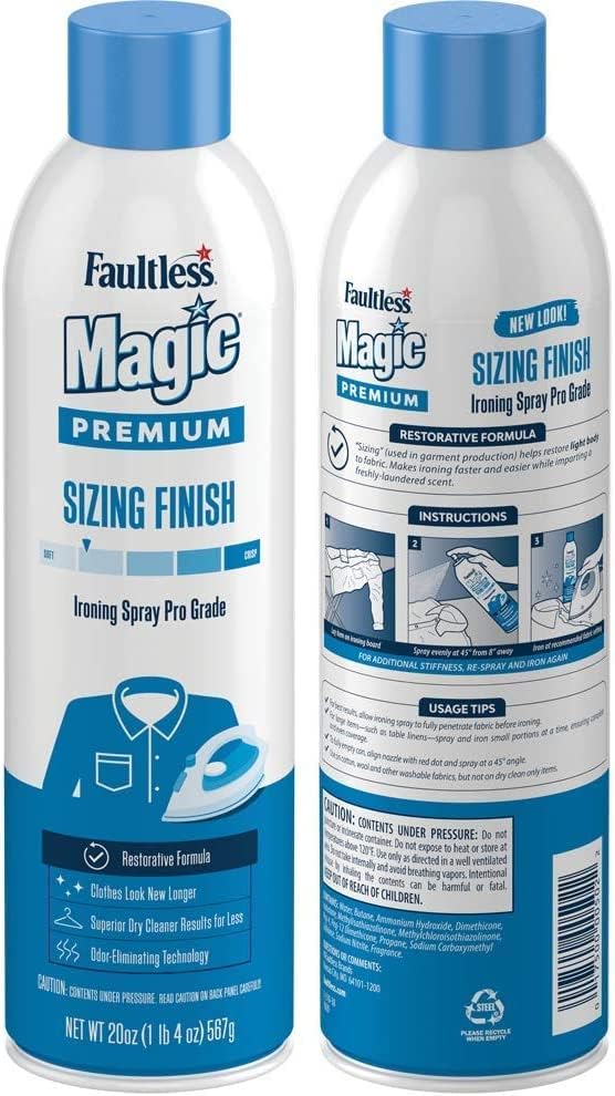 Magic Sizing restores original body to all washable fabrics. Use it to eliminate wrinkles on synthetics, blends, cotton and knits. Ideal for shirts, pants, wrinkle free fabrics and casual clothes.