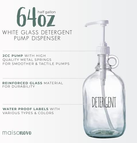 MaisoNovo’s large lightweight 1/2 gallon-sized crystal clear glass laundry soap holder is not only attractive in your home but great for refilling from those bulky value-sized products that are heavy and clumsy to handle. This detergent container is widely used to contain liquids such as shampoo, conditioner, gel, hand & body wash, laundry detergents, liquid soaps, etc. This liquid laundry soap dispenser is a simple and efficient solution to keep the liquids you use daily. This laundry beads dispenser is available with a pump that’s easy to press and durable, optimized to dispense the ideal amount of liquid.MaisoNovo Laundry Jug Features: One ½ gallon glass jug, one white dispensing pump, and one cap for storage. The strength of putting out 2cc flow per pump stroke. Allocate liquid detergent, liquid soap, maple syrup, oils, etc. It prevents spilling due to its wide and heavy bottom. This jug comes with two waterproof labels.MaisoNovo is a Brooklyn-based small business. We design all our products in New York and responsibly source our products in the US and around the world. We provide high standards of customer service and strive for 100% customer satisfaction. All purchases come with an extended warranty and free replacements once registered. Reach out to us through Amazon or directly whenever you need help!