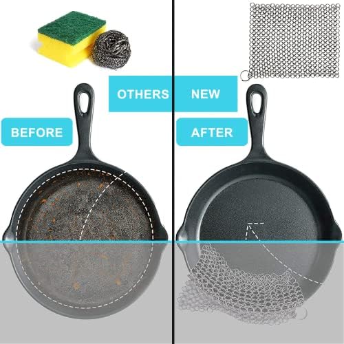 【EASY TO USE, SAVE CLEANING TIME】No soap or harsh detergent needed to when wash any cookware. This cast iron skillet cleaner is eco-friendly for you and your families. All you need for your cast iron cookware is a little normal water and chainmail scrubber for cast iron pans.