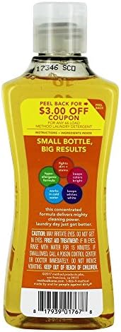 10 loads Naturally derived. Cleaning power. 3-in-1 Cleaning Power: powerful stain lifter; fragrance that lasts. HE for all washers. Made by and for people against dirty. methodhome.com. For more details go to methodhome.com/ingredients. Certified B Corporation. We’re certified to benefit our people + the planet. Bottle made from 100% recycled plastic (PCR). Recycle for good karma. Never tested on animals. Made in USA.